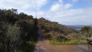 The trail crosses the fire road and continues to spiral around on its way up towards the peak. After a wooded and grassy flat portion, the trail ascends again towards a secondary peak. From there, it is not too much further to the real peak, which gives a 360 degree view around the island. Just short of the peak, there is a picnic table, probably within the 25m vertical activation zone. At the very peak itself, is a metal mast topped by a light and picnic table. On far size of the mast, i.e., walking down the hill towards the Golden Gate Bridge, there is another flat cement area with two picnic tables.