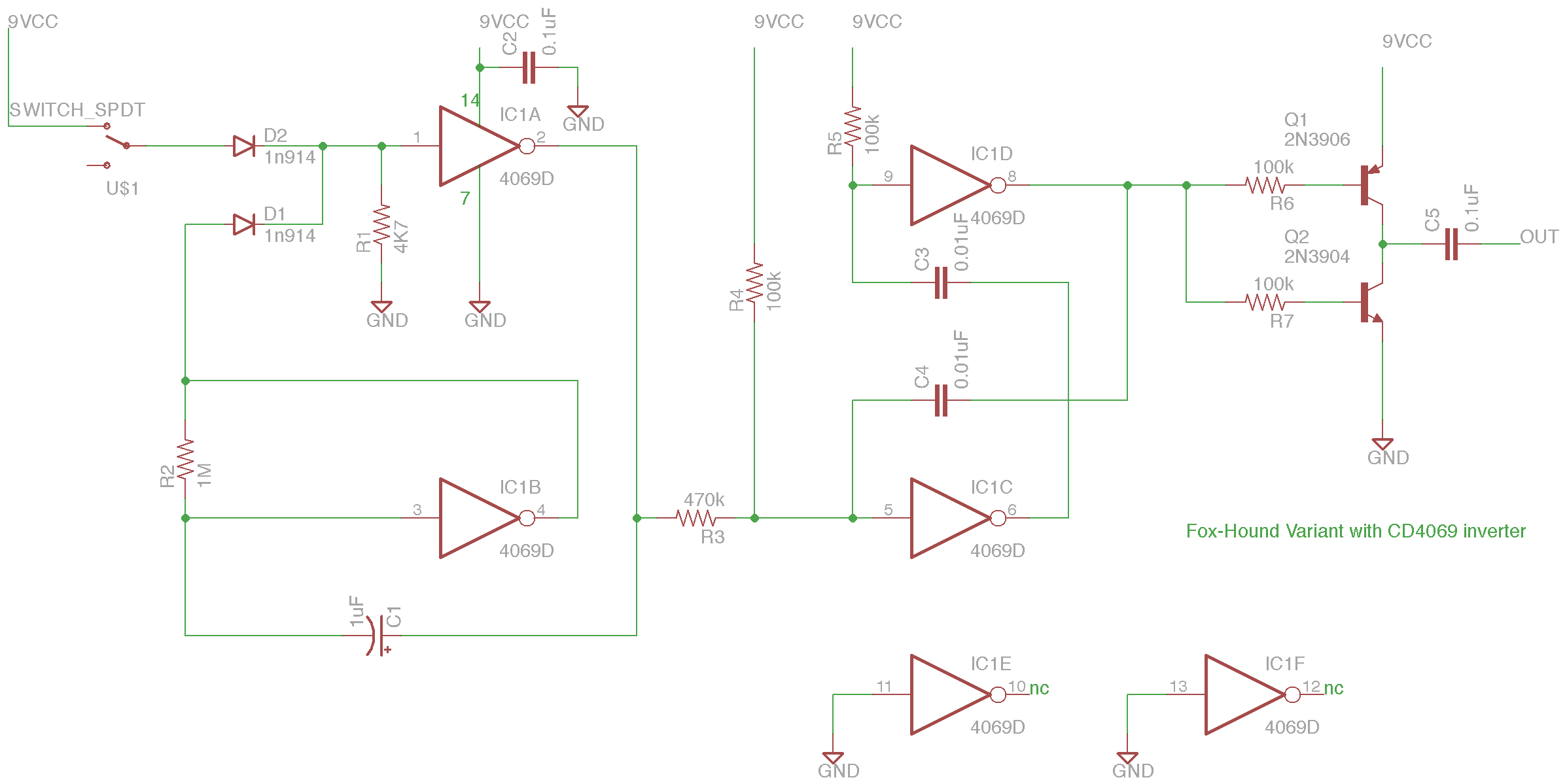 I built the fox generator circuit as presented on neatcircuits because I had the exact parts required on hand, although the N2907A was a crusty KN2907A (plastic package) that I had ripped out of something years ago. Likewise, the CD4001 was in the prehistoric section of the junque box, but still tested okay. The circuit gives either a steady or one-second alternating tone (~930Hz / 1160 Hz) depending whether one input in grounded or high.