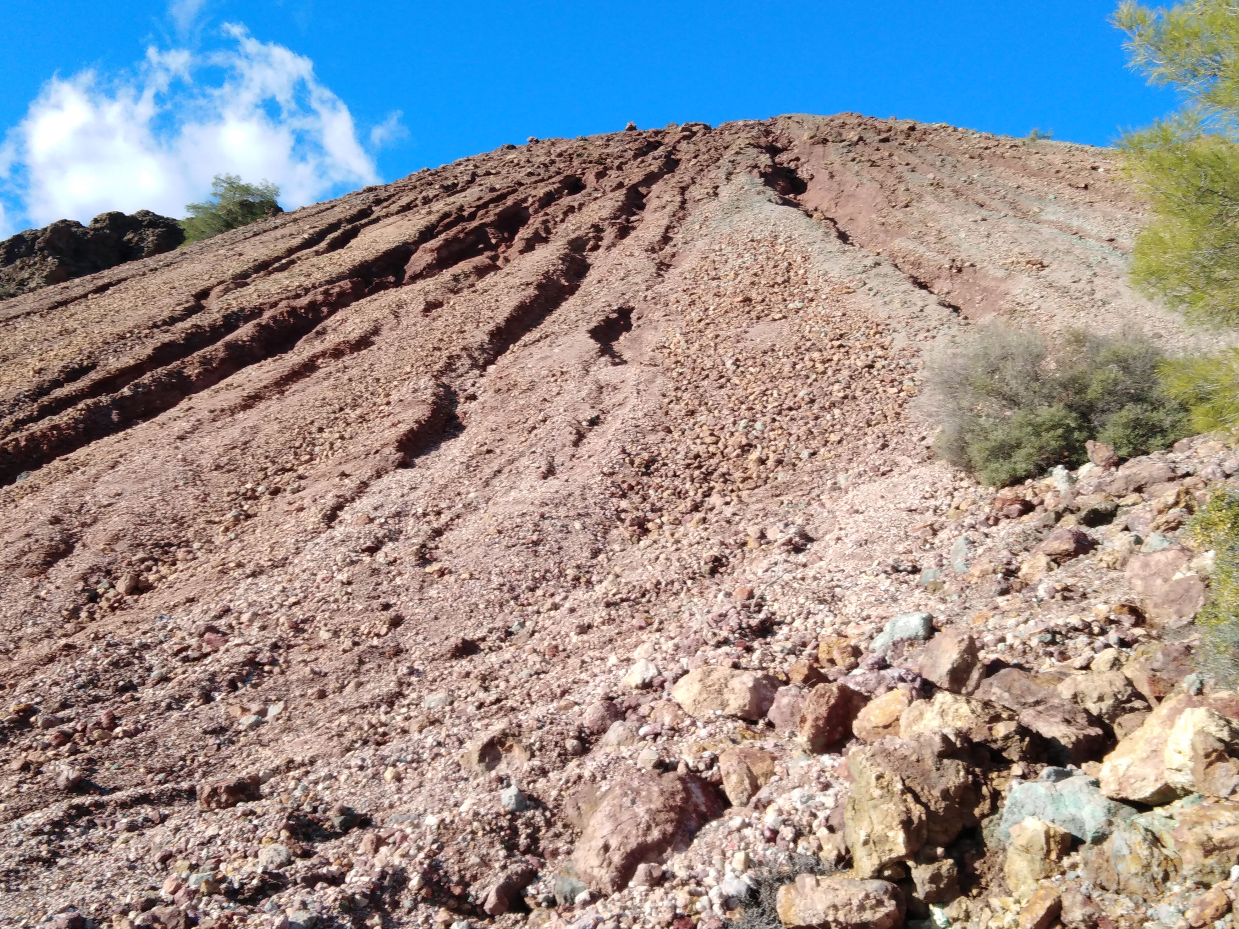 Concerning the way up to the top, he informed me that some time after the mine had ceased commercial operation, the town decided to close the road connecting his property with a highway to the south. That had been the main truck route up to that point, leaving him the smaller dirt road that I had come in on as his main access. After that, the path through his property to the mine area was no longer maintained. However, he informed me that it would be possible to drive along the mud road between the house and solar collectors and then turn right and upward. Past that point, a portion of the road towards the summit is still good up to the hairpin turn in the road. From there, the road is deeply fissured (indicated by more green x’s on the photo above), so it would be necessary to go on foot.
