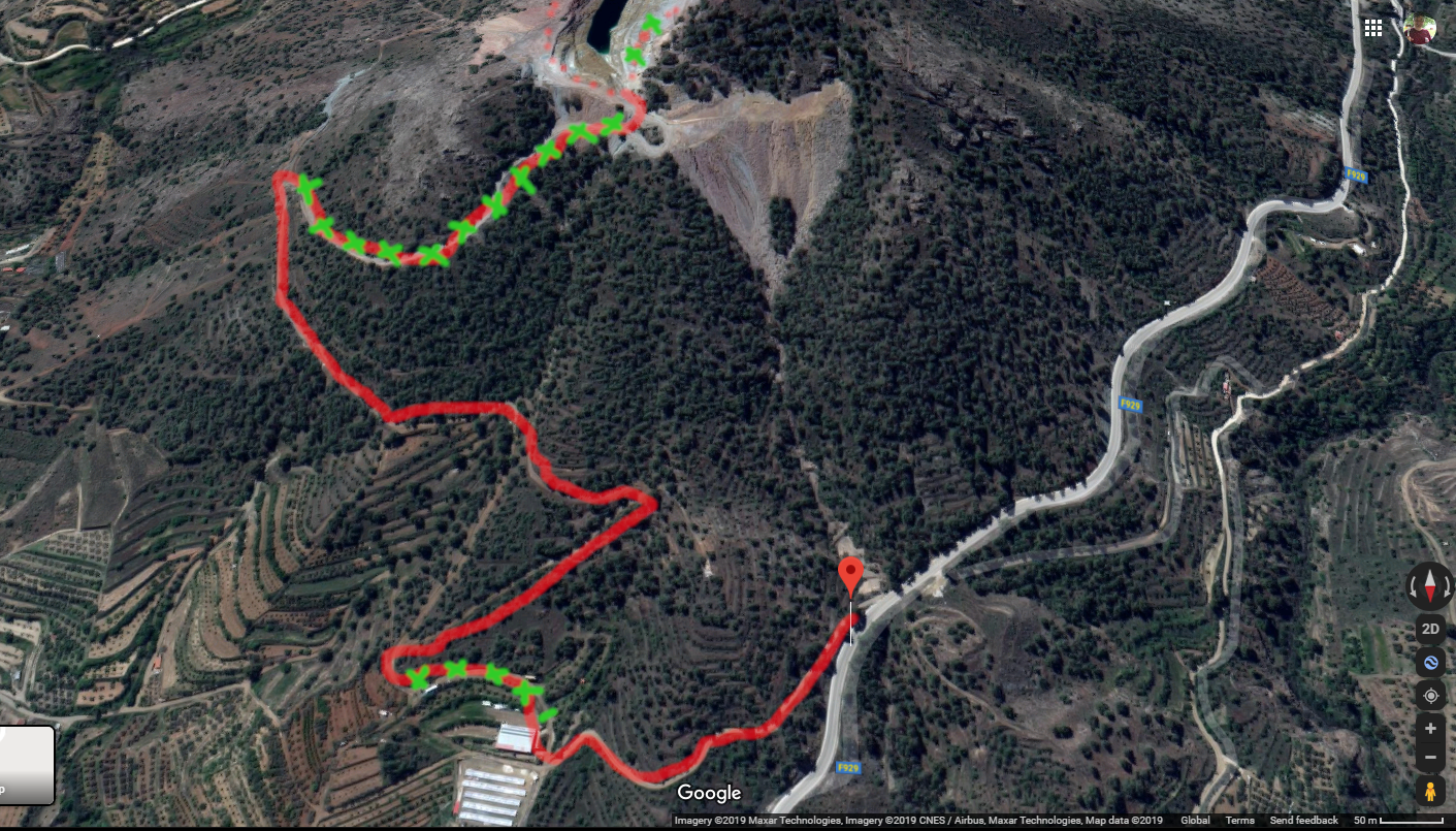 I based my approach on the GoogleMaps aerial photo: I planned to take the red path above. Note that photo is oriented South-up. The pin marks the turn off from the main road, and GoogleMaps was fine to get me to that point. In the direction that I was traveling down from Nicosia, that turn would have been very sharp. There is a grassy area on the opposite side of the road, though, can be used to turn the car around. From that turn onward, the road is dirt, or as it is now rainy season, mud. The road leads eventually to the buildings seen above. The lower one is actually a fenced area with solar panels and the upper is a house. On the photo, it appears that a road that wraps around behind the house and continues upward, but when I got there all I saw was a private driveway next to the house.