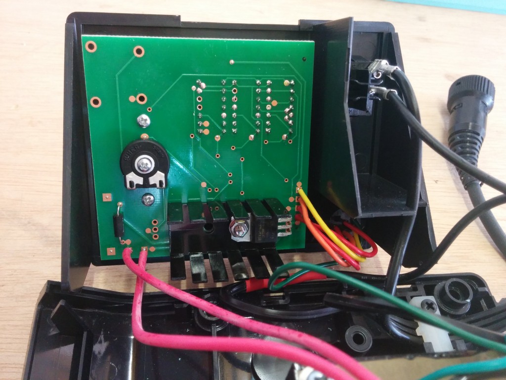 Previous Image Next Image backOfBoard Power enters the board below the potentiometer. A fuse is just above the wires. To their right is the BTA12-600 Triac that modulates the soldering iron temperature.